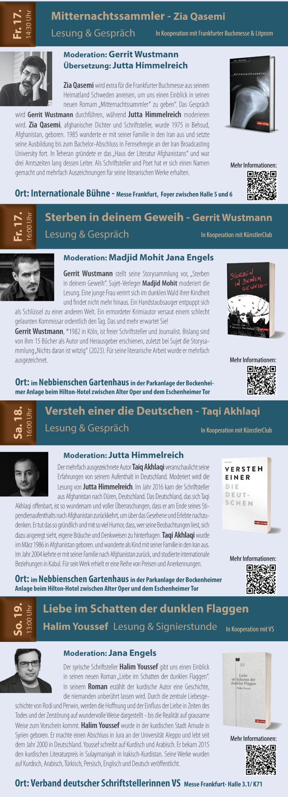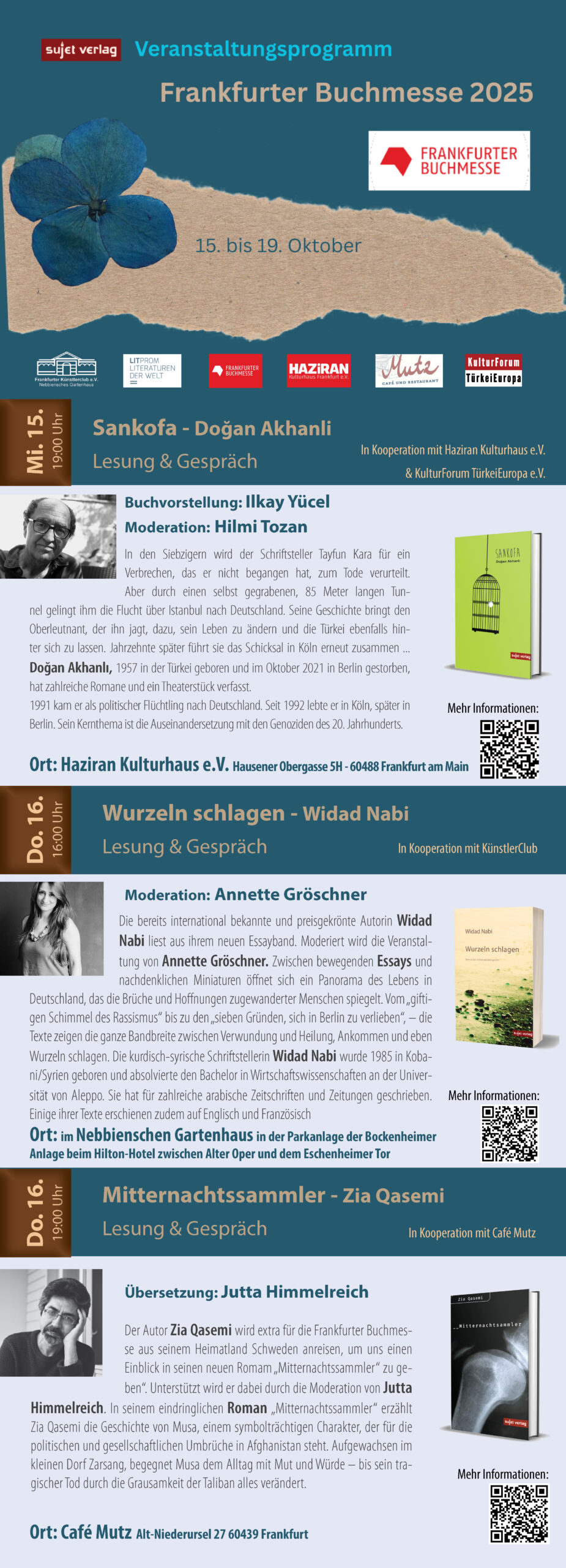 Der Sujet-Verlag ist dieses Jahr auf der Frankfurter Buchmesse mit spannenden Lesungen und einem Stand zum Stöbern und zum Austauschen. Der Stand befindet sich in Halle 3.1. B99. Weitere Infos zu den Veranstaltungen finden sich auf dem Flyer.
