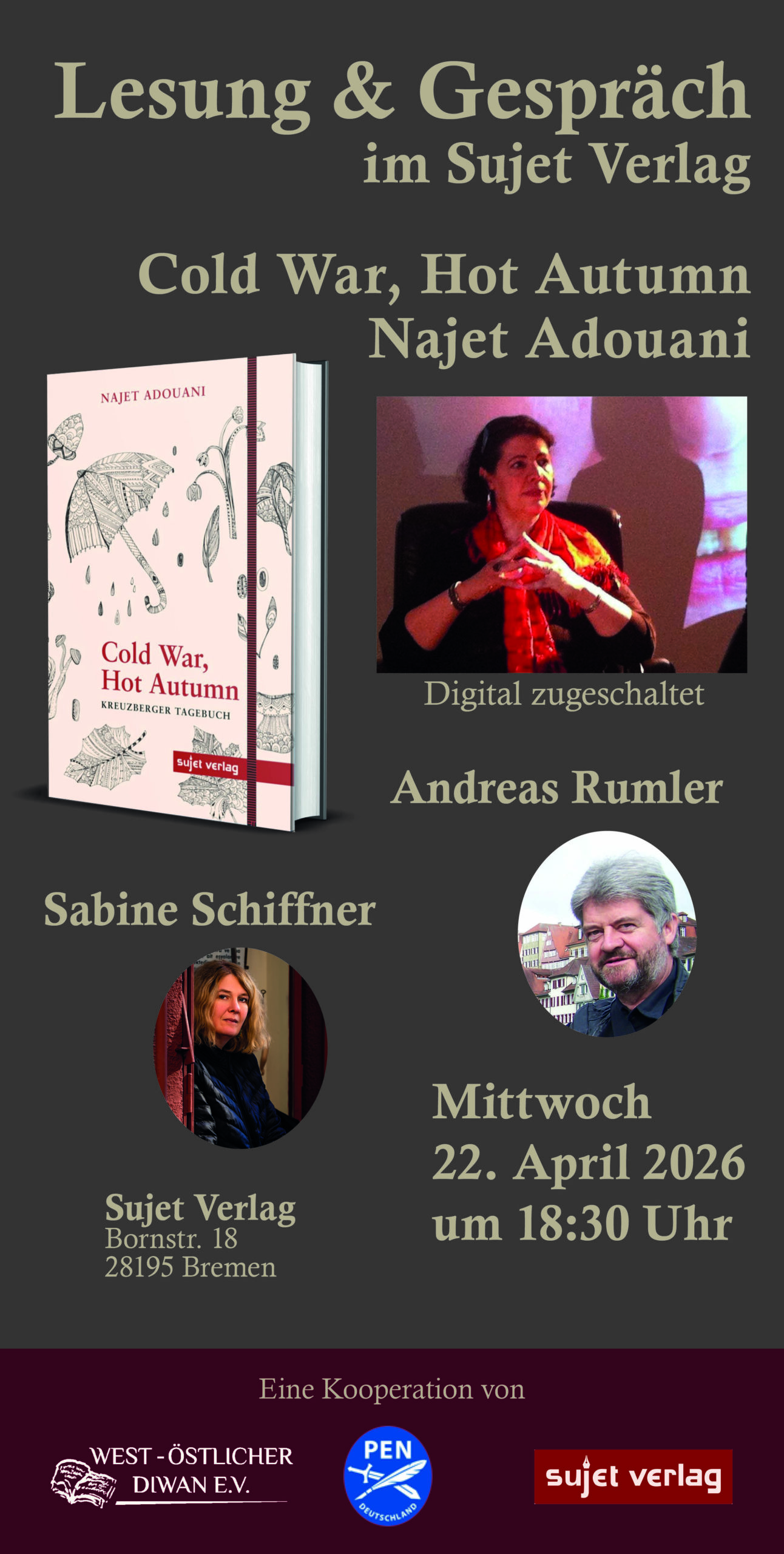 Mittwoch, 22. April 2026 um 18:30 Uhr Sujet Verlag Bornstr. 18, 28195 Bremen   Der Sujet Verlag lädt zur Lesung und Gespräch des Tagebuches „Cold War, Hot Autumn“ der tunesischen Autorin Najed Adouani ein. Das Werk, aus dem Englischen von Christa Schuenke übersetzt, verbindet autobiografische Erfahrungen mit literarischen Erzählformen. Im Zentrum des Abends steht das literarische Werk, das Najet Adouani, bereits in ihrer Jugend begann. In Tagebuchform schildert sie ihr Leben in Berlin-Kreuzberg und zeichnet ein eindruckvolles Bild eines urbanen Viertels, geprägt von …